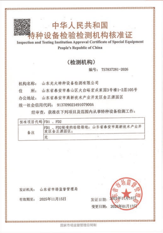 山東光大特種設備檢測有限公司是經山東省市場監督管理局核準的甲類B1特種設備綜合檢驗機構。2017年9月30日取得了山東省市場監督管理局頒發的《檢驗檢測機構資質認定證書》。2018年2月22日取得了山東省市場監督管理局頒發的《特種設備檢驗檢測機構核準證》(起重機械)檢驗檢測資質。2021年11月取得山東省市場監督管理局版發的《特種設備檢驗檢測機構核準證》(安全閥在線、離線)校驗資質。2023年11月取得山東省市場監督管理局頒發的甲類檢驗機構B1《特種設備檢驗檢測機構核準證》,具有壓力容器(RD2...